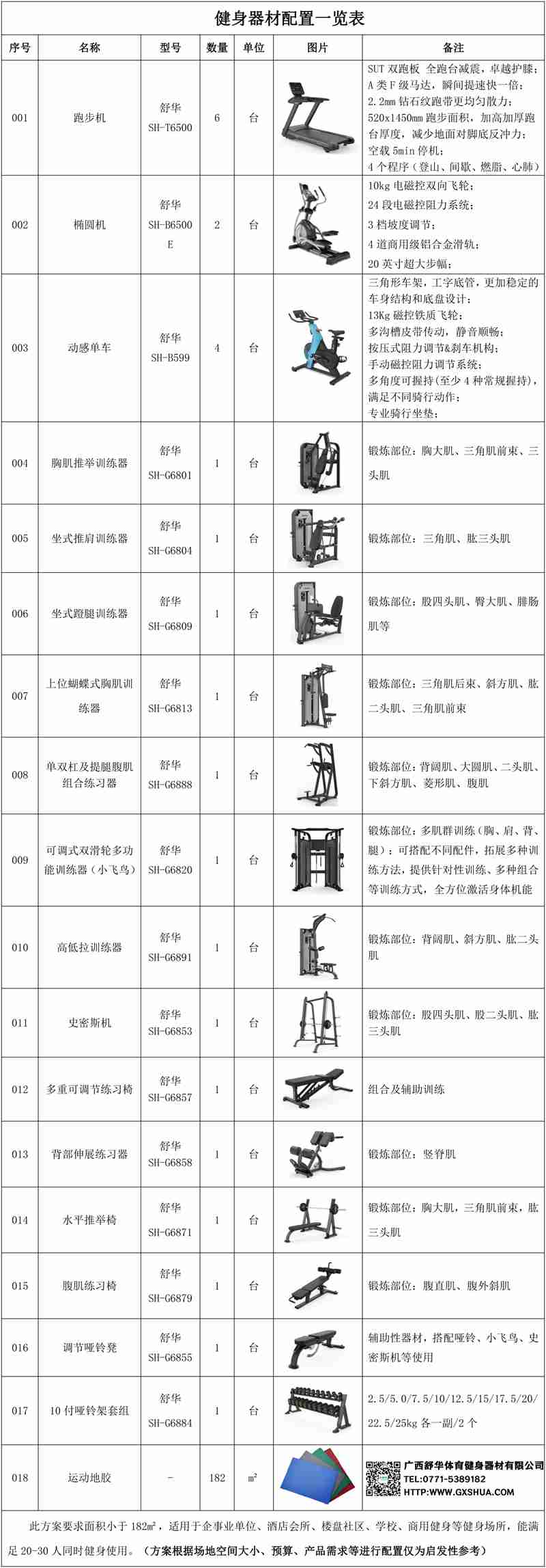 此方案要求面积小于182m²,适用于企事业单位、酒店会所、楼盘社区、学校、商用健身等健身场所,能满足20-30人同时健身使用。(方案根据场地空间大小、预算、产品需求等进行配置仅为启发性参考)